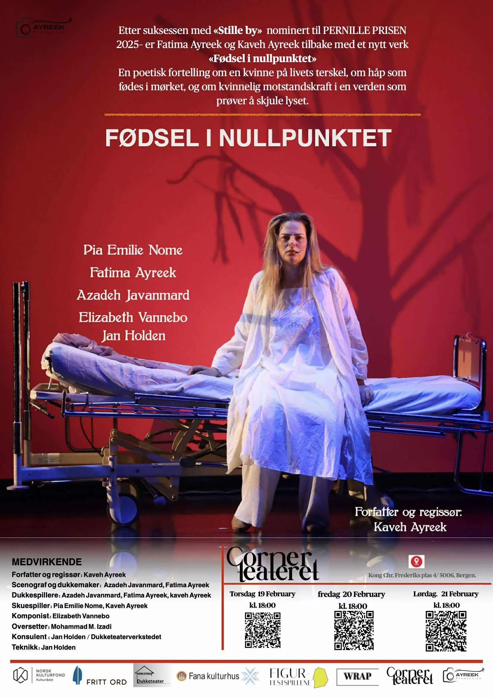 En kvinne står i nullpunktet av sitt liv. Mellom fortid og fremtid. Mellom det hun er, og det hun får lov til å være. Hun lever i en verden der kjærlighet må skjules, der glede og dans blir sett på som en trussel, og der lyset holdes borte bak tunge regler og andres tro. Likevel bærer hun på en indre glød – en vilje til å holde fast ved sin menneskelighe i et samfunn som forsøker å kue både kropp og sjel. «Fødsel i nullpunktet» er en poetisk og gripende teaterforestilling om kvinnelig motstandskraft, om håp som fødes i det mest sårbare øyeblikket, og om menneskets grunnleggende behov for frihet, verdighet og lys.