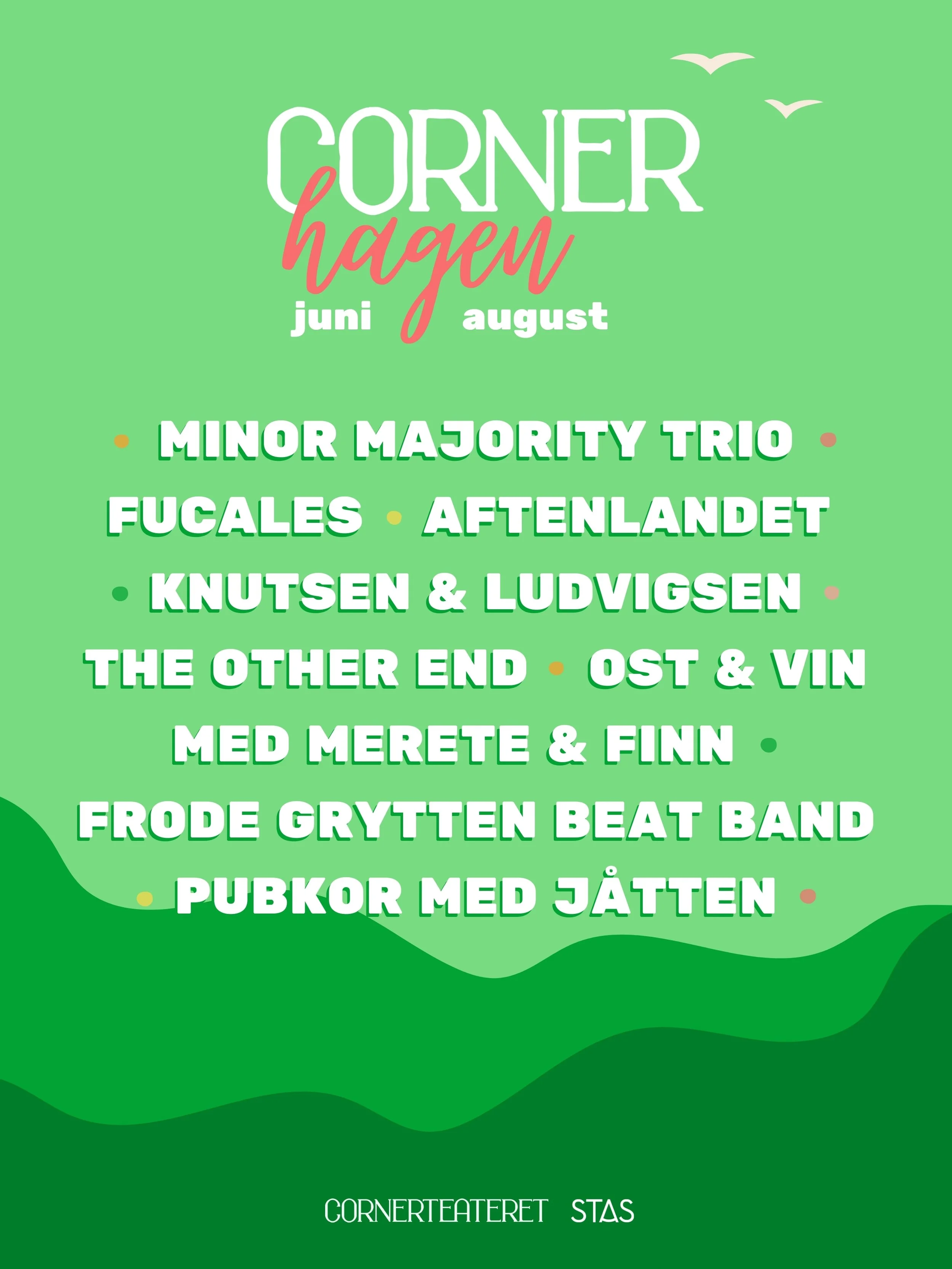 Gjennom hele sommeren vil Stas Artist i samarbeid med Cornerteateret i Bergen by på en utescene i hagen med god musikk fra kjente og kjære artister, humorkvelder med standup, samt familieforestillinger til glede for de minste.Vi håper på sol og skyfri himmel, men heldigvis er arrangementet under tak om regnet skulle komme.Ta med en venn og kom og nyt kulturopplevelser i Cornerhagen!